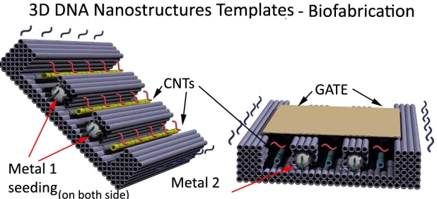 In particolare, la biofabbricazione tramite array di CNT guidati da strutture di DNA (DNA-templated CNT arrays FETs) ha dimostrato di poter migliorare ulteriormente l’allineamento dei CNT all’interno dei FET, superando i limiti della litografia convenzionale.